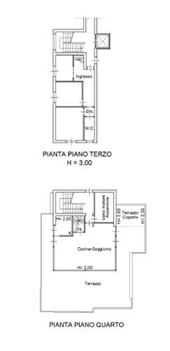 L'immobile presenta un ingresso al terzo piano su un disimpegno, soggiorno, bagno con finestra e 2 camere da letto. Tramite una scala interna , si arriva al quarto piano dove insiste un ampio vano adibito a zona giorno con terrazzo e aperto su tre lati. Inoltre si può accedere anche da altro ingresso autonomo, che rendei due piani potenzialmente indipendenti.